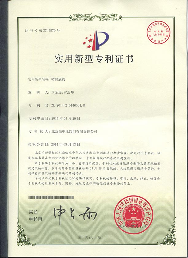 我公司研制開發的噴射底閥于2014年3月29日申請實用新型專利。該專利于2014年8月13日獲得專利權【專利號:ZL201420146561.8】。