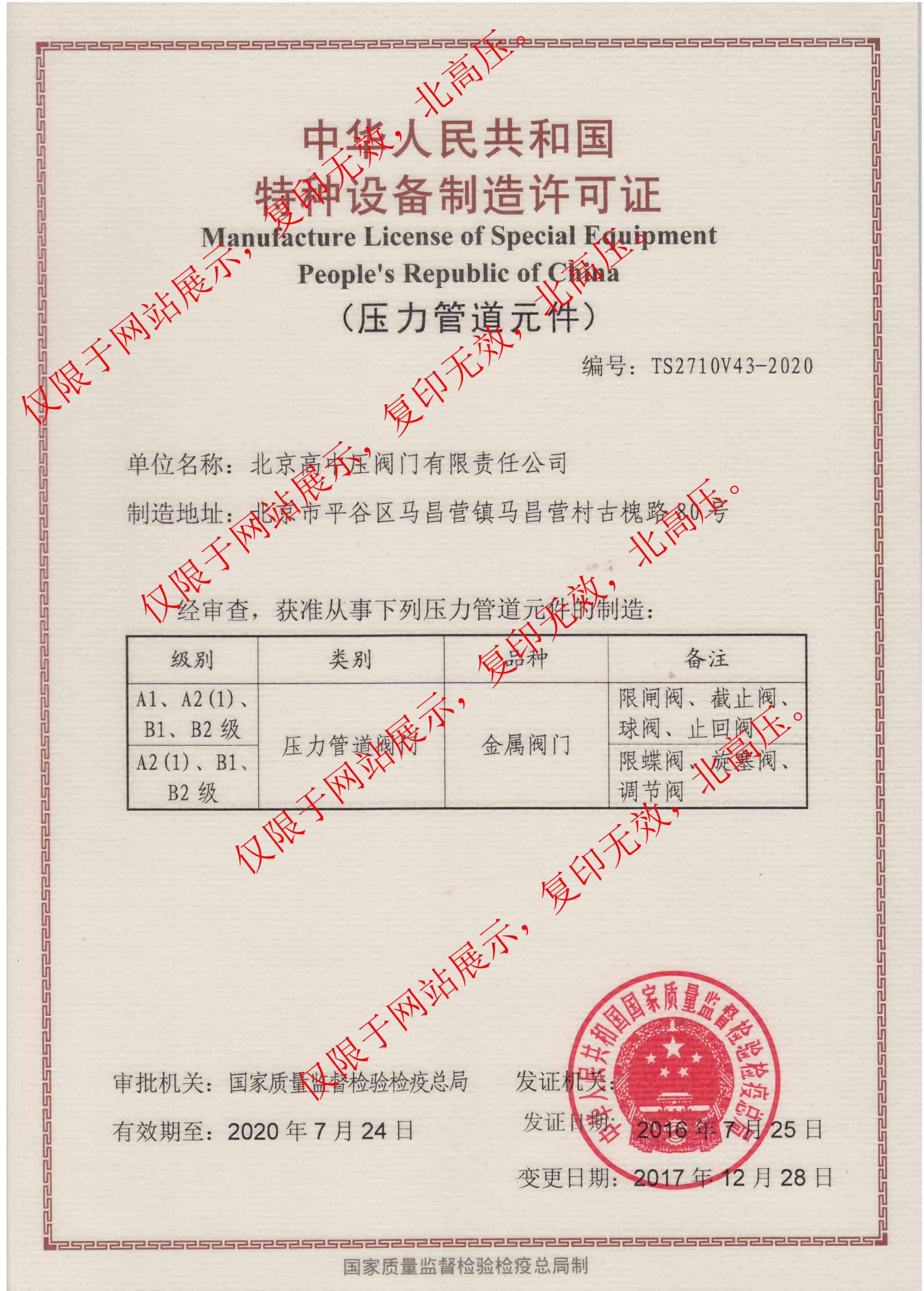 2017年12月28日,我司獲得中華人民共和國特種設備制造許可證(壓力管道元件)A1級證書資質。