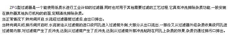 1、ZPG-L1型過濾器在全流量下正常工作,即保持高的流量,又具有低的壓力降,避免了由于流速低而 造成的表面污漬。