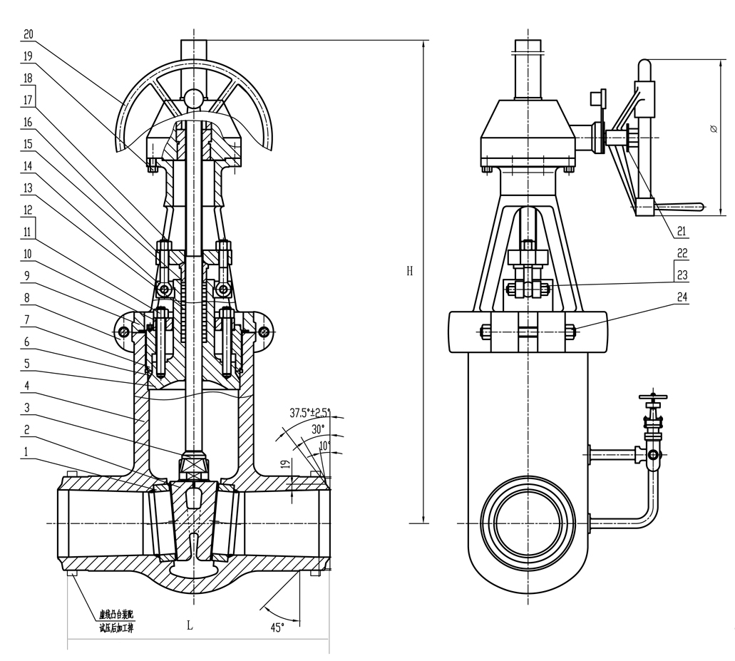 5、閥門設有壓力平衡裝置。(帶旁通閥)。