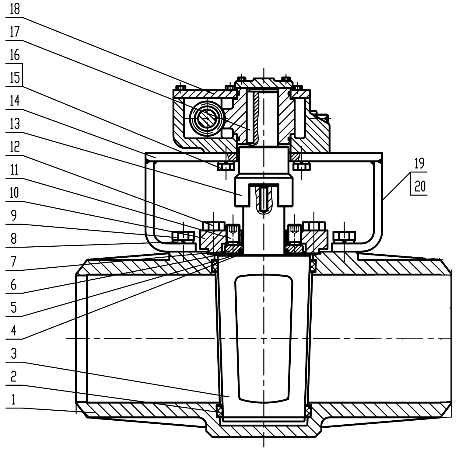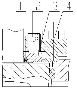 旋塞閥除有主密封外還有多道輔助密封系統(tǒng),中法蘭部分就是其中之一,可確保-29 ℃~121℃溫度范圍內(nèi)防止外露。該密封裝置由一只PTFE V型密封模片:(1)一只PTFE密封墊(2)一只金屬墊片(3)一只金屬止推壓蓋(4)金屬閥蓋所組成。見圖4