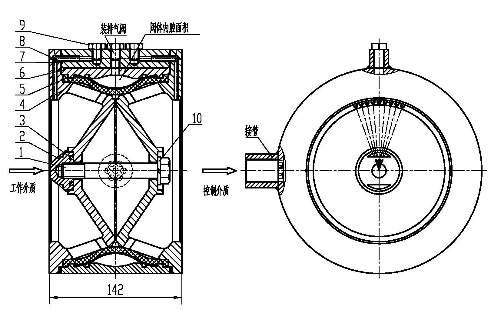 4、該閥門開啟、關閉由遠距離控制系統來實現。(控制柜),實際閥門工作原理就是一個面積差的問題(見裝配圖)閥芯細小通道總面積<閥體內腔的總面積。閥門開啟:工作介質進入閥內,介質壓力把橡膠套筒沖開,排除閥體內腔氣體,閥門開啟,介質流入閥門另一側(控制系統裝有換向閥換向)閥門關閉。通過控制系統換向,介質由控制介質接管迅速進入閥體內腔,閥體內腔總壓力>閥芯通道總壓力,閥門迅速關閉。 |